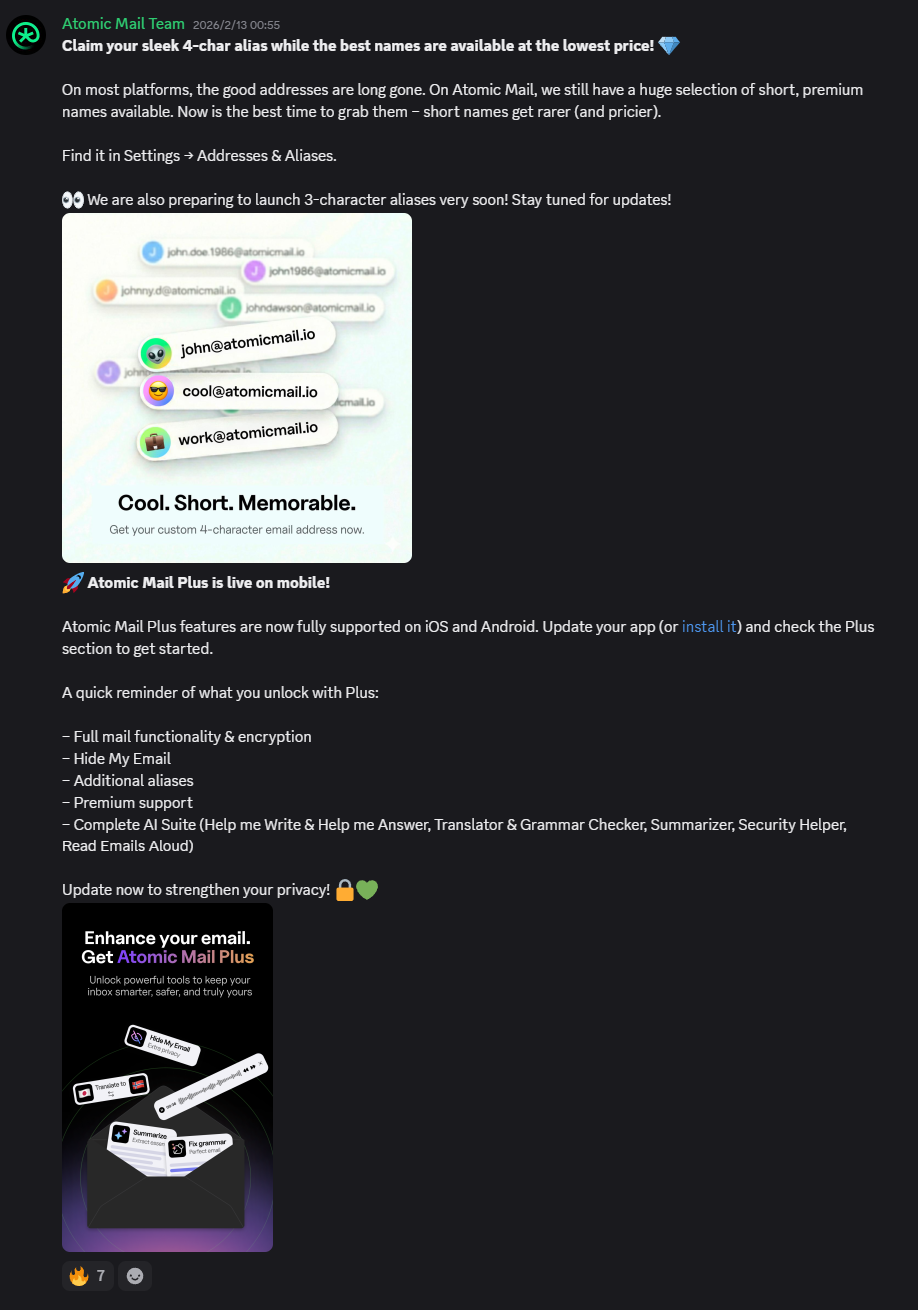 <feImage>标签就能指示 SVG 解析器加载 href 属性里面的资源, 绕过了用户的 Webmail 远程资源加载偏好, 这是由于 SVG 的规范复杂性同时 Roundcube 的 HTML 清洗逻辑里面未包含对该标签的处理导致的. 该漏洞已被分配编号 CVE-2026-25916. [1] - 本月 13 日, 新兴加密邮件服务商 Atomic Mail 推出 Plus 付费套餐, 提供临时收件地址, 额外别名, 高级客户支持和完整 AI 功能, 定价为 US$5.99 每个月或 US$59.88 每年. 同时也开始销售四位长度的保留短位别名, 还表示未来会开放销售三位长度的别名. [2]